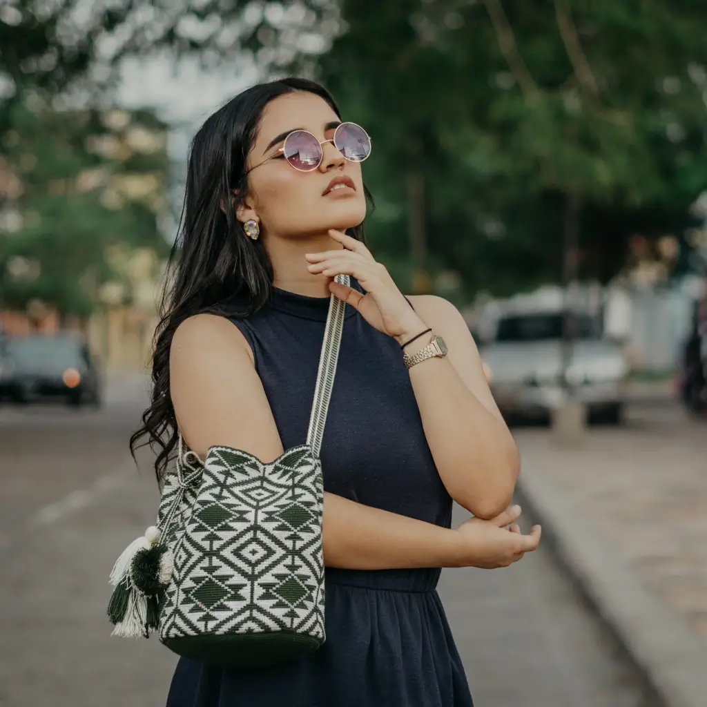 This unique Shigra Combinada is a handmade wool bag with a short strap, featuring a beige and olive green color combination. With its practical size (27 cm height and 23 cm base), it’s perfect for carrying your everyday essentials with a touch of tradition and style.
