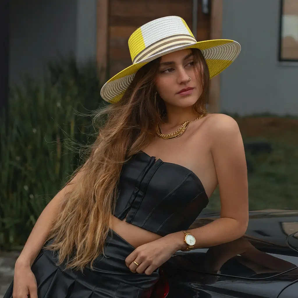 This elegant Toquilla straw hat showcases a vibrant, modern design that blends traditional craftsmanship with a contemporary aesthetic. Its classic wide brim and flat crown are enhanced by a bold two-tone geometric pattern, featuring alternating segments of vibrant yellow and natural beige on both the crown and the brim—creating a dynamic, eye-catching visual effect.