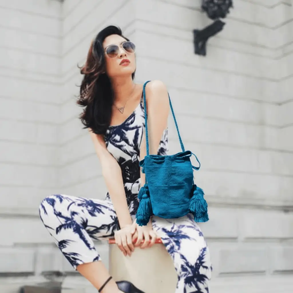 This vibrant Shigra in solid turquoise brings together tradition and modern elegance. Handwoven from 100% wool by skilled artisans in the Ecuadorian Andes, it features a long strap ideal for shoulder or crossbody use. Its size — 27 cm in height and 20 cm in base — makes it a practical yet eye-catching accessory for everyday life.